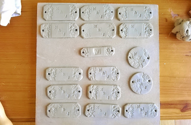 | These are the tags after the inicial firing, they have kept the curved shape during the firing quite well, so they should fit around the jars very nicely. |